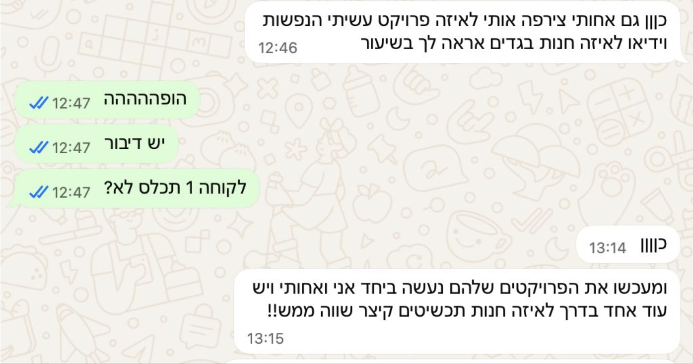 אפרת הגיעה לליווי כמעט ללא ניסיון, אבל בלי ביטחון ובלי לקוחות בכלל. היא פחדה לסגור עבודות כי הייתה בטוחה שהיא עדיין לא מספיק טובה. כבר במהלך הליווי היא סגרה את הלקוחות הראשונים שלה באלפי שקלים, ואחרי כמה חודשים בלבד פתחה סטודיו ליצירת תוכן AI בתחום הביוטי והאופנה, עם פרויקטים קבועים והכנסות של עשרות אלפי שקלים בחודש.